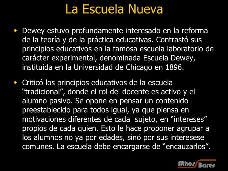 Su propuesta educativa puede resumirse en dos ideas: que la educación tiene que ser activa, basada en la práctica y la experiencia; y que como la experiencia humana nos plantea problemas que deben ser resueltos, educar debe consistir en enseñar a pensar.